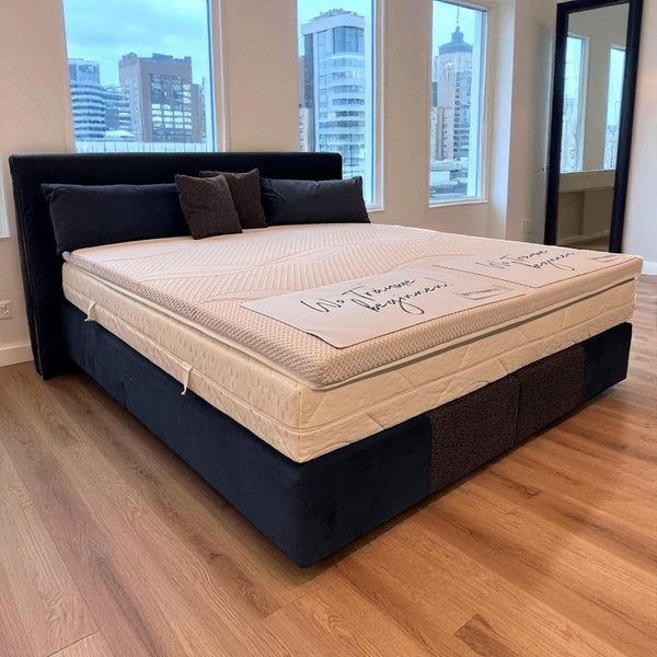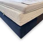 Das Boxspringbett Soest vereint modernes Design mit höchstem Schlafkomfort. Der elegante Stoff in Blau-Grau und das fein gesteppte Kopfteil machen dieses Bett zu einem stilvollen Blickfang in jedem Schlafzimmer. Die Kombination aus hochwertiger Kaltschaummatratze, komfortablem Topper und stützender Partnerfederung sorgt für ergonomischen Liegekomfort.